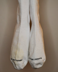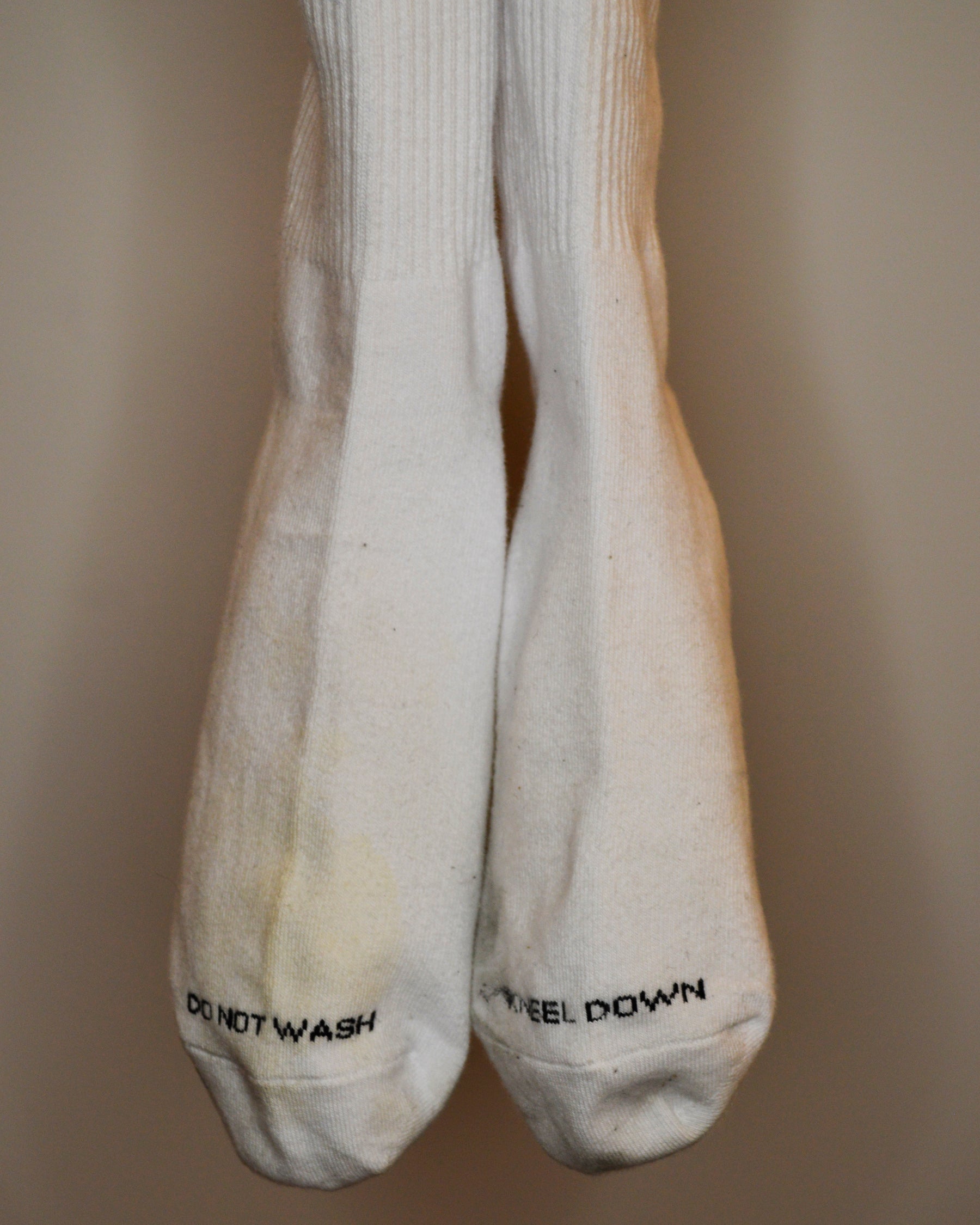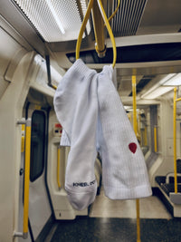 The socks translate Antinoo’s symbol into a wearable gesture — a single red drop placed along the leg.